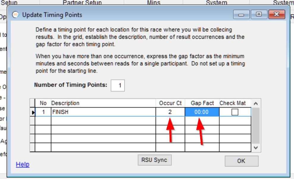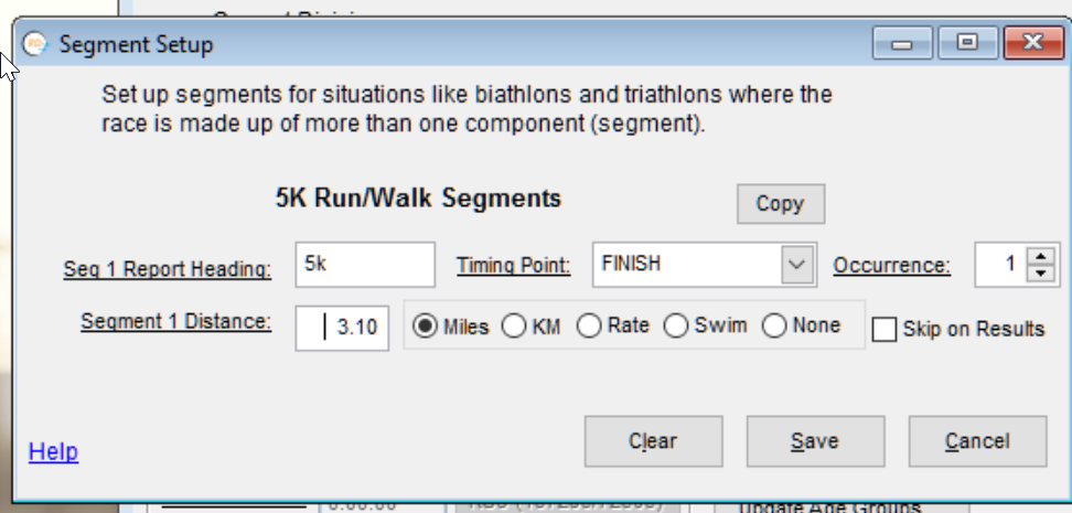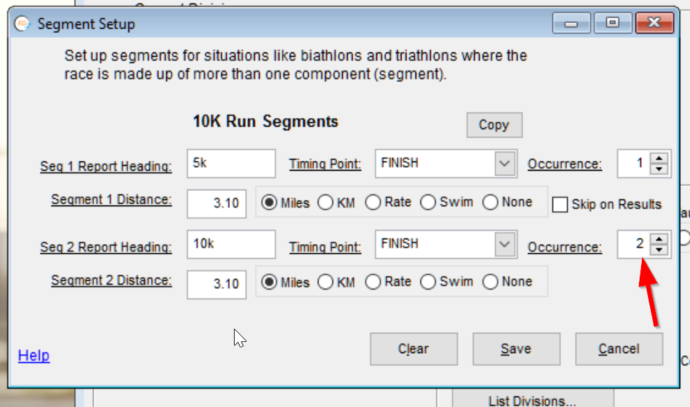 First you'll need to set up Tailor > Options > Results 1. Change the Race Segments dropdown to Two Segments then click the Timing Points button. Here you define how many physical timing points you will have. In your case it is just one. Set the Occur Ct to 2 so that RD will look for two passings per participant on this Timing Point, then set the Gap Factor to something less that the fastest time that you expect in a lap (maybe 12 minutes for a 5k loop). Then click OK.Now check the Segment Definitions Vary By Division checkbox, as we will be defining Segment Definitions differently in the 5k than the 10k (The 5k will have one segment, and the 10k will have two).Now you can close out of this screen and go to Tailor > Divisions.Select the 5k division on the left, then click Segments and type in the Segment Count. For your case this should be 1.On the next screen you'll want it to look like this (the Report Heading can be anything you like):Next click Save and we'll do the same with the 10k, but defining 2 segments instead of 1.In this case we'll need to set the Occurrence for the second segment to 2, so RD will count the second read at this Timing Point as the time to use for this Segment.Then click Save and you are all set!Let me know if you have any questions.
